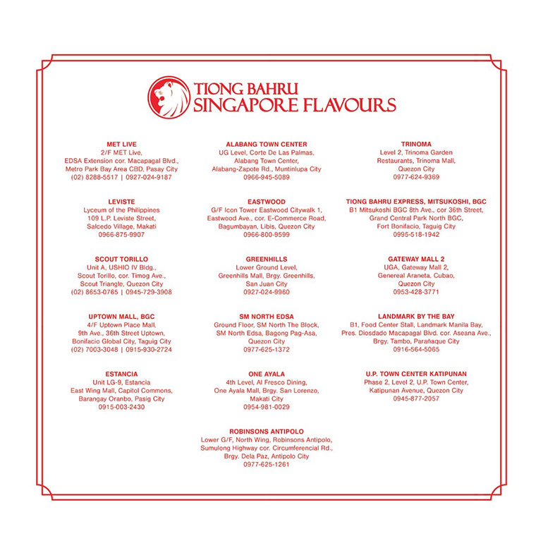 For updates and more information, follow Tiong Bahru Singapore Flavours on Facebook (Tiong Bahru Singapore Flavours), Instagram (@tiongbahruph), and TikTok (@tiongbahruph).