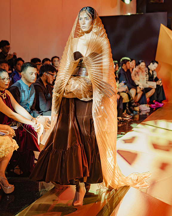 The Oct. 15 Ayala Museum show featured a heist theme, promoting Toblerone’s new product, diamond-shaped Toblerone Truffles. It’s no surprise then that some of the clothes reminded one of chocolate: for example, Mr. Ang opened his show with a model in a rich brown velvet dress with a sweetheart neckline, all veiled in gold. There was a pleated brown dress draped gracefully over the bust, with a matching pleated cape (in an interview, he talked about mimicking the effect of melting chocolate).