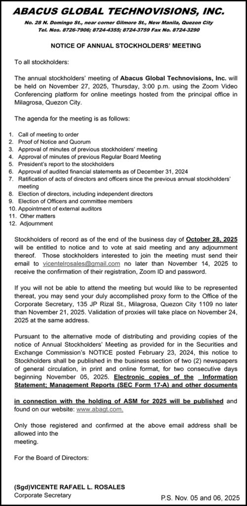 Abacus Global Technovisions, Inc. to hold its Annual Stockholders’ Meeting on Nov. 27 via Zoom