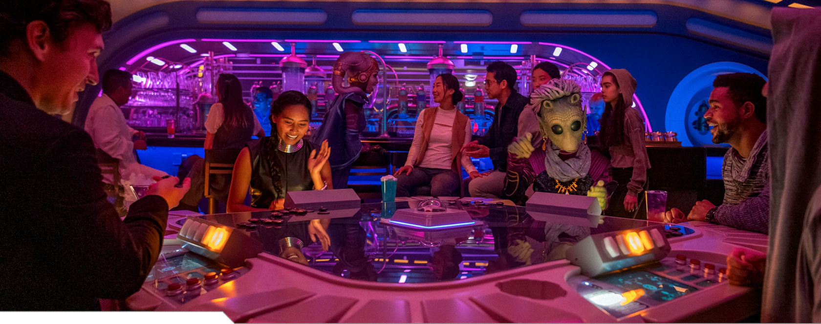 Disney’s designers hope visitors embrace the chance to play a role in the fictional world created by George Lucas. Guests on the Halcyon can interact with space droids, or Han’s hairy sidekick Chewbacca, and meet new characters.