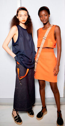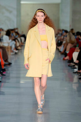 MAX MARA’S Spring-Summer collection takes notes from a film Bonjour Tristesse, written by the French playwright Françoise Sagan. The story’s protagonist, Cécile, gets to enjoy all the hedonistic and glamorous pastimes that Sagan would only dream of living out on a real vacation. Max Mara dissects the sartorial persona of a Cécile de nos jours: the bourgeois rebel. Sagan’s own style, easy beatnik chic, points to workwear classics; the fisherman’s smock, the laborer’s jacket, the mechanic’s overalls and carpenter pants are reimagined with prêt-à-porter finesse. In crisp gabardine, canvas, poplin, and denim, they feature precise contrast top stitching. Tank tops and boyish sandals with chunky crêpe soles complete the bad girl look; chiffon embroidered with wispy feathers is a diaphanous counterpoint. The color palette runs from sand to tan, to navy to black, but there are pops of orange and yellow too.