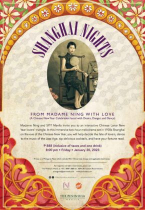 SHANGHAI NIGHTS: From Madame Ning with Love (A Chinese New Year Celebration with Desire, Danger, and Dance) will be held on Jan. 20, 8 p.m., at The Peninsula Manila’s Salon de Ning. The evening will feature the improv group SPIT in an immersive two-hour melodrama featuring a love triangle, set in 1920s Shanghai on the eve of Chinese New Year. The audience will help decide the fate of lovers to the tune of the music of the Jazz Age, as they sip on cocktails and have their fortunes told. The evening’s festivities cost P888 (inclusive of taxes and one drink). For inquiries and reservations call 8887-2888 local 6694.