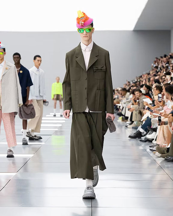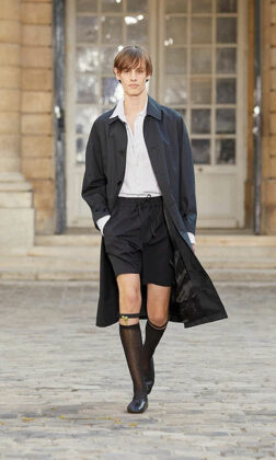 Models strode through a column-lined hallway of the Musee de l’Armee in central Paris, overlooking the monument’s gilded dome. They paraded suitcoats that ranged from long and slightly boxy, to short and pinched at the waist, paired with low-crotched trousers.