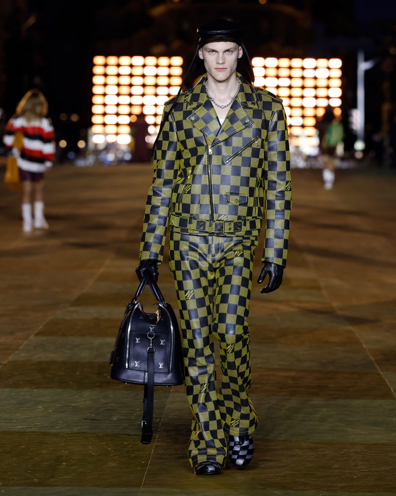 In a show that further anchored the LVMH-owned label in popular culture, models strode across the gold-painted runway to live music. They paraded pearl-embellished tracksuits, furry outerwear, and sparkling jackets with the label’s signature checkmark pattern, in all colors and sizes, including shades of camouflage.