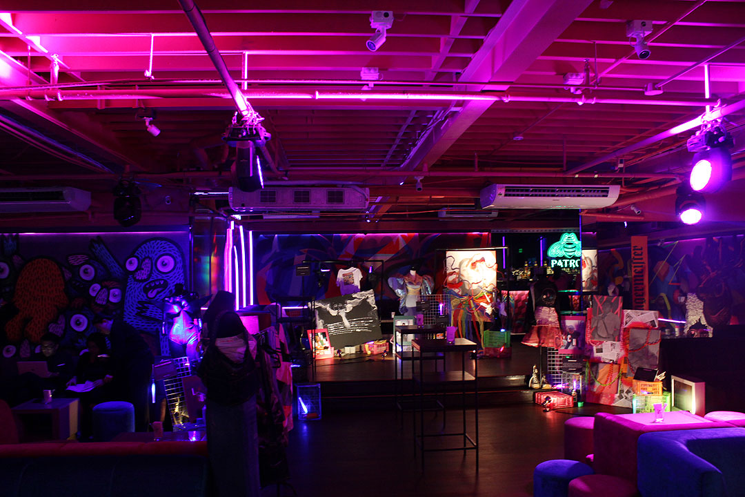 Icha Logaring showed an outfit with early 2000s references, showing his own “Babygirl” energy. Graffiti, plastic chains, and grayscaled portraits are juxtaposed beside the clothes as an accompanying piece. Maximhari Sales showed a sky-blue dress with leg-of-mutton sleeves, as well as a portrait draped with rainbow-colored strips of cloth. Nev dela Merced showed a stylized self-portrait with weapons and foil spectacles, while Senna Purugganan showed a jacket with many zippers recalling their journey with ADHD.