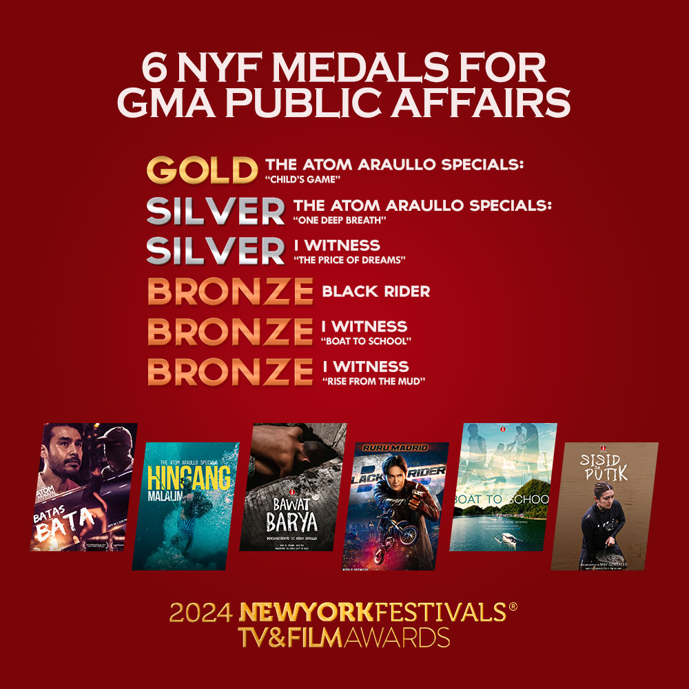 SEVEN medals were brought home by GMA Network from the 2024 New York Festivals TV & Film (NYF) Awards. The virtual Storytellers Gala, held on April 17, awarded The Atom Araullo Specials a World Gold Medal for the documentary “Batas Bata” (Child’s Game) in the Social Justice category. It also earned a silver medal for “Hingang Malalim” (One Deep Breath), under the Human Concerns category. GMA Public Affairs’ flagship documentary program I-Witness clinched three medals this year — a silver for a Social Issues documentary by Mr. Araullo and a bronze each from Howie Severino’s “Boat to School” and Mav Gonzales’ “Sisid sa Putik” (Rise from the Mud). The action-packed drama series Black Rider won a bronze medal in the Entertainment Program: Drama category while Sundo: A GMA Integrated News Documentary, won a Bronze Medal in the News Program category.