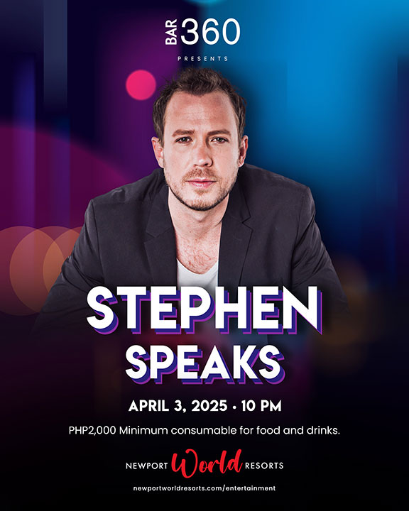 AMERICAN pop singer Stephen Speaks will be bringing his iconic hits “Passenger Seat,” “Out of My League,” and more to Filipino audiences in Manila with a one-night-only performance on April 3, 10 p.m., at Newport World Resort’s Bar 360. There is a minimum cover charge of P2,000, consumable on food and drinks.