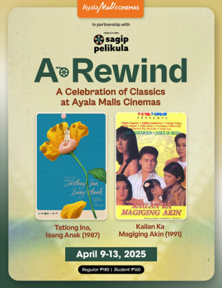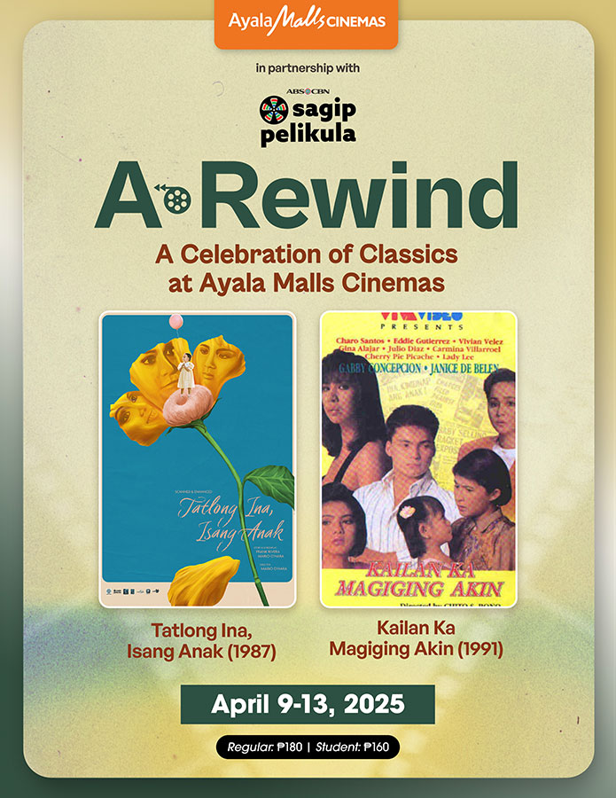 AYALA Malls Cinemas and ABS-CBN Film Archives are introducing “A Rewind,” an initiative that celebrates Filipino heritage by screening restored Filipino film classics. To be shown from April 9 to 13 are Kailan Ka Magiging Akin, directed by Chito Roño and starring Janice de Belen, Gabby Concepcion, Charo Santos, Gina Alajar, Eddie Gutierrez, and Cherry Pie Picache; and Mario O’Hara’s Tatlong Ina, Isang Anak, featuring Nora Aunor, Gina Alajar, Celeste Legazpi, and Matet. These films will be screened at Ayala Malls The 30th, Ayala Malls Cloverleaf, Ayala Malls Fairview Terraces, Ayala Malls MarQuee Mall, and Ayala Malls Legazpi. Tickets are priced at P180 for regular tickets and P160 for students, who must present a valid school ID upon purchase.
