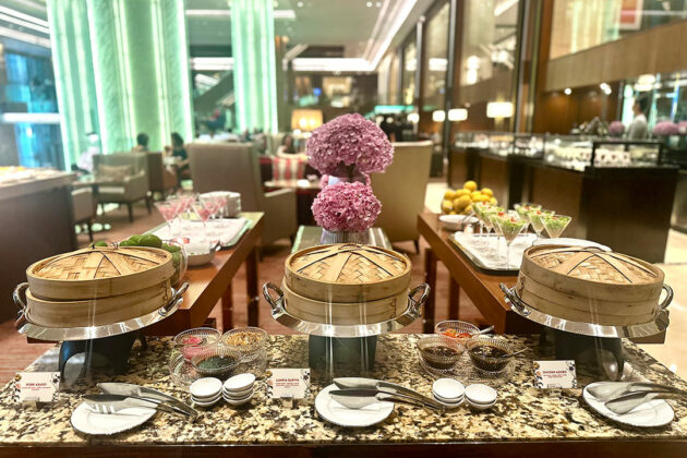 One level above the massive lobby is an open space with plushy couches and chairs. It provides a panoramic view of the interiors while affording a discreet presence. Every day from 2 p.m. till late afternoon, this spacious stretch is a watering hole for easy listening music and light finger food. A pianist plays popular melodies that set the mood at the Grand Merienda Cena. It spreads a selection of curated cakes, savory sandwiches, and tarts. Included are the signature cheesecake, almond Florentine cake, pistachio kataifi cake, Earl Grey mousse, mocha hazelnut and ice cream sundaes. Some of the open-face sandwiches available are crispy sisig cigar prepared with pork, chicken liver and calamansi aioli, home cured Norwegian salmon with citrus, dill cream cheese and capers, beef salpicao with striploin steak and shrimp toast enlivened with tobiko spicy aioli.