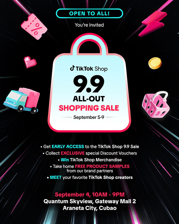 A TIKTOK SHOP activation has been mounted at the Quantum Skyview, Upper Ground B of Gateway Mall 2 in Araneta City, Cubao, Quezon City. It is meant to kick off TikTok’s 9.9 All-Out Shopping Sale by featuring various brands and deals. Its goal is to allow mallgoers to experience the energy, trends, and buzz of TikTok’s shopping scene in person. It runs until Sept. 9.