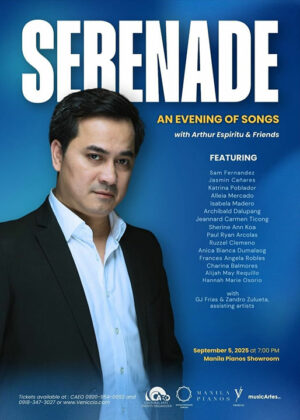 THE concert Serenade: An Evening of Songs with Arthur Espiritu and Friends will take place on Sept. 5, 7 p.m., at Manila Pianos Showroom, Ronac Lifestyle Center, Paseo de Magallanes, Makati City. The show features 15 young singers who will showcase their vocal prowess and musicality after undergoing an intensive four-day workshop under the tutelage of Filipino tenor Arthur Espiritu. The concert will also feature Najib Ismail as pianist. For tickets, call 0920-954-0953, 0918-347-3027 or reach out via www.veniccio.com.