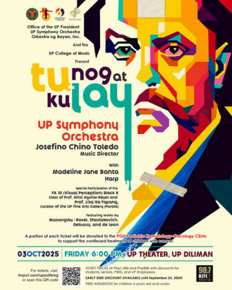 THE UP Symphony Orchestra will be joined by harpist Madeline Jane Banta in the concert titled Tunog at Kulay. The repertoire features pieces by Mussorgsky, Ravel, Debussy, Shostakovich, and De Leon. The show is in support of the PGH Pediatric Hematology-Oncology Clinic. The evening also features the participation of a Fine Arts 10 (Visual Perception) class of Mitzi Aguilar-Reyes and UP Fine Arts Gallery (Parola) curator Lisa Ito-Tapang. It is set for Oct. 3, 6 p.m., at the UP Theater, Diliman, Quezon City. Tickets cost P750, with registration via http://tinyurl.com/upsottkreg.