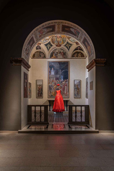 Garments including striking blue and red dresses are set among Italian art masterpieces from the Middle Ages to the 19th century.