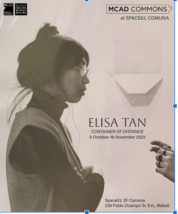 ARTIST Elisa Tan will hold an exhibition and a talk this month. Titled Elisa Tan: Container of Distance, the show brings the works of the late Filipino-Chinese conceptual artist to Space63 Comuna in Makati City. It is part of MCAD Commons, an exhibition project which offers the programming of the Museum of Contemporary Art and Design (MCAD) of the De La Salle-College of Saint Benilde to a larger audience. The talks, led by scholar-curator Dr. Maria Cristina Juan and professorial lecturer Dr. Flaudette May Datuin, will expound on the late artist’s works and creative process. It will be held on Oct. 11 at 3 p.m. The exhibit is free and available for public viewing until Nov. 16 at Space63, Comuna, 238 Pablo Ocampo Sr. Ext., Makati City.