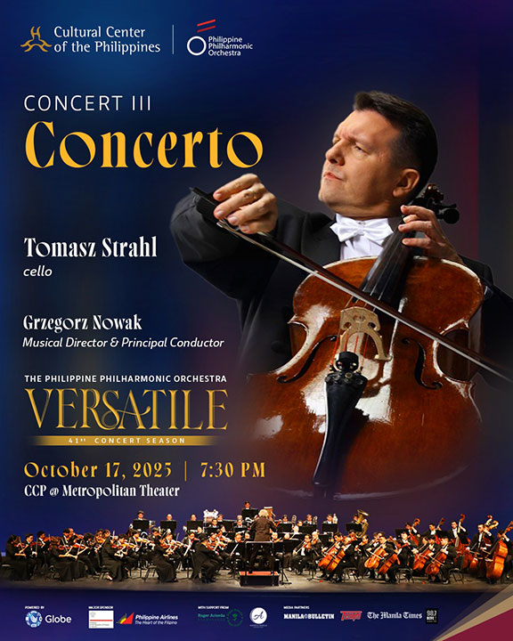THE NEXT CONCERT of the Philippine Philharmonic Orchestra (PPO) will feature cellist Tomasz Strahl as the guest. It will also see the world premiere of Jeffrey Ching’s Creation Fugue and Arctic Chase, along with Schumann’s Cello Concerto in A minor, and Lutosławski’s Concerto for Orchestra. Under the baton of Grzegorz Nowak, the concert will take place on Oct. 17, 7:30 p.m. at the Metropolitan Theater in Manila. Tickets are available via TicketWorld.