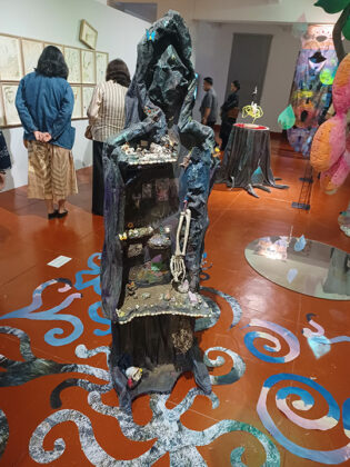 Jel Suarez also puts value in small fragments through her ink-brush collage art, which depicts found objects like book pages and scraps of various materials assembled together then lit up to cast shadows onto the wall.