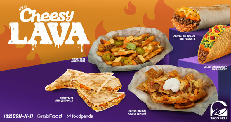 TACO BELL is serving up the new Cheesy Lava sauce in featured items like the Cheesy Lava Crunchy Taco Supreme (starts at P159), made with seasoned beef, shredded lettuce, cheddar cheese, diced tomato, and Cheesy Lava sauce inside a crispy taco shell. There’s also the Cheesy Lava Grilled Stuft Burrito (starts at P219), made with seasoned beef, Mexican rice, a two-cheese blend, and the signature Cheesy Lava sauce, wrapped in a flour tortilla. For sharing, try the Cheesy Lava BBQ Nachos Supreme (starts at P199), made with seasoned nacho chips topped with beef, cheese sauce, sour cream, diced tomato, and a layer of Cheesy Lava sauce. There are also the Cheesy Lava Beef Quesadilla (P199) and the Cheesy Lava Loaded Fries (starts at P299). Diners can add an extra serving of the fiery Cheesy Lava sauce for P39. The Cheesy Lava Crunchy Taco Supreme, Grilled Stuft Burrito, and Beef Quesadilla can come as a combo with a side of Nacho Sprinkle and a 12oz soda for an additional P70. Shareable items like the Cheesy Lava Nachos Supreme and Loaded Fries can also be paired with a 12oz soda for P30 more. Available at Taco Bell store for dine-in and take-out orders. They can also be ordered for delivery via Grabfood, foodpanda, and Pickaroo (prices may vary).