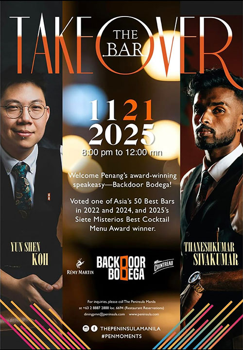 On Nov. 21, Mr. Koh, along with his colleague Thaneshkumar Sivakumar, brought Backdoor Bodega to Peninsula Manila’s The Bar for a takeover.