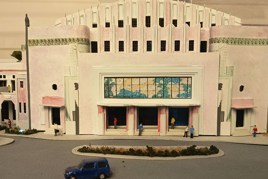 The exhibit cites the first expression of Art Deco in the Philippines as The Chapel of the Crucified Christ at St. Paul College in Manila, featuring hints of Art Deco juxtaposed with tropical-Gothic themes. Prominently featured in the exhibition is the Manila Metropolitan Theater, built in 1931. It survives today as one of the finest examples of Art Deco architecture in the Philippines — a fate not shared by many buildings built in the period. For example, while the exhibition also celebrates the Manila Jai Alai building, it did not survive to the present day — not due to the Second World War (the exhibition notes the wartime damage taken by other Art Deco landmarks such as the aforementioned theater, the Rizal Sports Complex, Quezon Bridge, and the Crystal Arcade shopping center), but due to bureaucracy and the passage of time — the building was demolished in 2000 by then Manila Mayor Lito Atienza, despite an intense effort to save it, to make way for a new Manila Hall of Justice (which was never built).