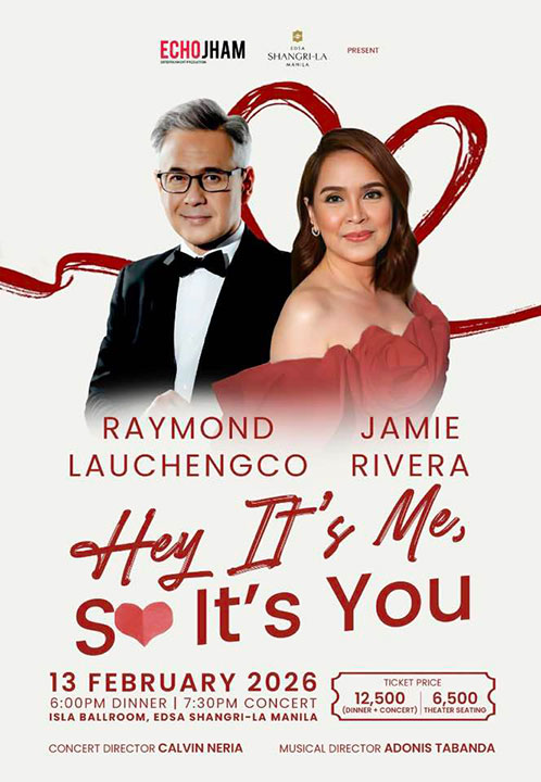 TWO iconic singers — Raymond Lauchengco and Jamie Rivera — are coming together on Feb. 13 for an evening of nostalgia, grace, and heartfelt magic. Starting at 7:30 p.m. at the Isla Ballroom of the Edsa Shangri-La Manila, their music will celebrate love for a special Valentine’s show. Reservations can be made through 0932-404-9551.