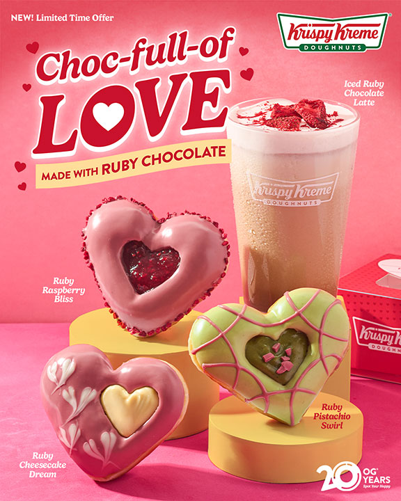 THIS Valentine’s Day, Krispy Kreme is spreading the love with its Choc-full-of-Love, made with Ruby Chocolate, a limited-time collection of heart-shaped doughnuts and a latte made to share. The Ruby Pistachio Swirl is dipped in pistachio chocolate coating, topped with ruby chocolate swirls, pistachio-custard topping, and ruby chocolate bits. Ruby Raspberry Bliss is dipped in ruby chocolate coating, with sides coated with dried raspberry bits, and finished with berry topping. Ruby Cheesecake Dream is dipped in ruby chocolate coating, decorated with white chocolate hearts, and finished with cheesecake. All are heart-shaped. These can be paired with the Iced Ruby Chocolate Latte, made with a mix of espresso, milk, and raspberry syrup, topped with sea salt kreme, dried strawberries, and finished with strawberry drizzle. They are available in all Krispy Kreme stores nationwide and are available for dine-in, take-out, drive-through, and delivery through https://now.krispykreme.com.ph, 888-79000, and GrabFood, FoodPanda, Pick.A.Roo, OrderMo, and Groover.