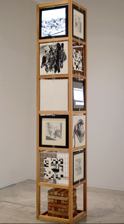 The vertical rectangular structure contains vistas of high-rise and densely populated districts, juxtaposed with scenes of indoor spaces, inviting viewers to reflect on the confines of an urbanized and digitalized society. Compounding this is the bottom half of the installation, seemingly held up by Jenga-like bricks.