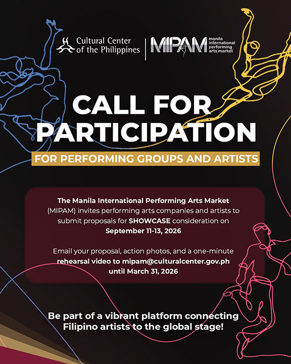 THE Manila International Performing Arts Market (MIPAM), organized by the Cultural Center of the Philippines and CREATE Philippines, is inviting performing arts companies and artists to submit proposals until March 31 for showcase consideration. Performance groups and individual applicants for MIPAM 2026 must submit a proposal, including attached action photos and a one-minute rehearsal video, to mipam@culturalcenter.gov.ph. Bold and original works in folk reinterpretation, contemporary, and street-pulse styles are highly encouraged, as well as cross-border collaborations and tech-driven performances. MIPAM 2026 will take place from Sept. 11 to 13 at the Tanghalang Ignacio Gimenez (CCP Blackbox Theater) at the CCP Complex in Pasay City.