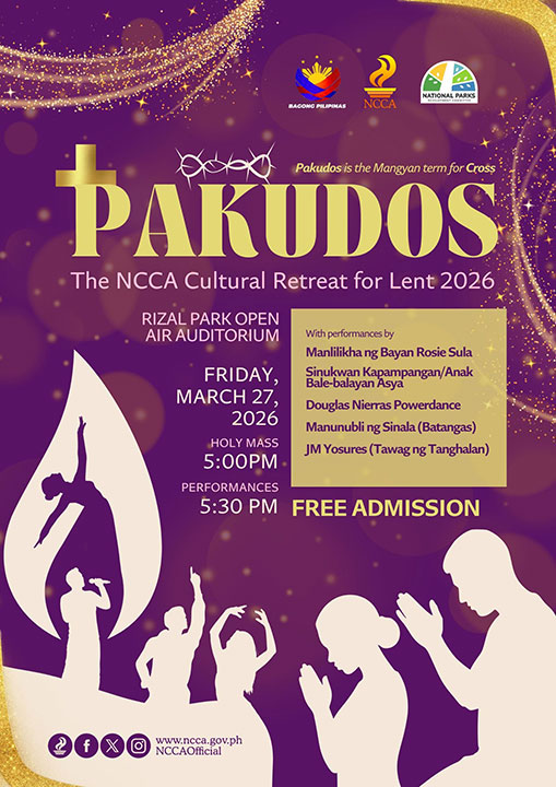 THE National Commission for Culture and the Arts (NCCA) will be staging its first Lenten cultural recollection, titled Pakudos. The activity will kick off with a Holy Mass and be followed by a cultural performance by MB Rosie Sula, Sinukwan Kapampangan, Powerdance, Manunubli ng Sinala, and JM Yosures, who are all respected cultural performers from their regions. The Lenten presentation will be held on March 27, 5 p.m., at the Rizal Park Open-air Auditorium in Manila.
