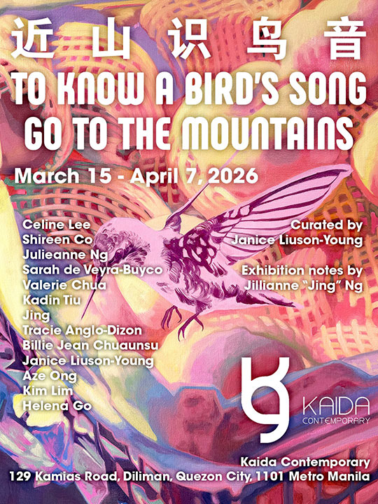 AS PRODUCTS of migration, the Filipino-Chinese are a multi-hyphenate people with an identity in constant flux. This will be explored in Kaida Contemporary’s ongoing exhibit for women’s month, To know a bird’s song go to the mountains , curated by Janice Liuson-Young. Anchored on reinterpretations of the titular Chinese proverb, the exhibit seeks to unpack the reconfigurations of home through the works of 13 female Filipino-Chinese artists: Celine Lee, Shireen Co, Julieanne Ng, Sarah de Veyra-Buyco, Valerie Chua, Kadin Tiu, Jing, Tracie Anglo-Dizon, Billie Jean Chuaunsu, Janice Liuson-Young, Aze Ong, Kim Lim, and Helena Go. It runs until April 7 at Kaida Contemporary, located on 120 Kamias Rd., Diliman, Quezon City.