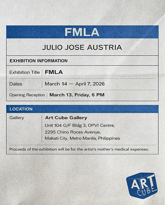 AN EXHIBITION titled The Family and Medical Leave Act (FMLA) is the 18th solo show of Julio Jose “Jojo” Austria, a Filipino artist based in New York City (NYC). FMLA is defined as unpaid and job-protected time off granted to employees specifically to care for an immediate family member, administered by the United States’ Department of Labor. The show poster was based on an actual form that the artist filled out as a Museum of Modern Art (MoMA) worker of nine years. Here, the term leave of absence (LOA) takes on a dual meaning — for the artist, a return to familial duty in the Philippines, his physical absence in studio bringing a different kind of presence within the paintings themselves. FMLA runs until April 7 at Art Cube Gallery at the OPVI Center, 2295 Chino Roces Ave., in Makati City.
