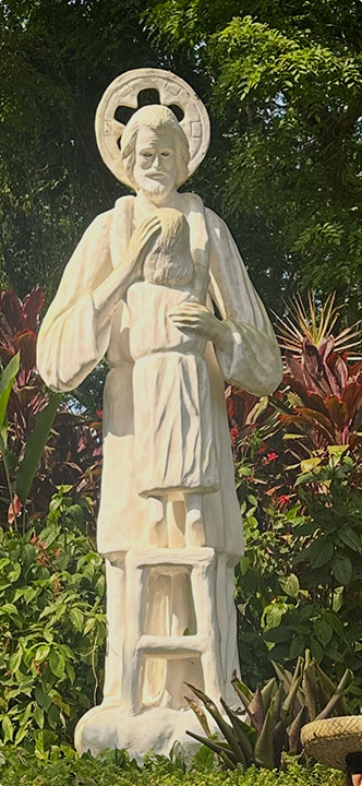 Right by the entrance was a log bench before a statue of St. Joseph, seemingly extending an invitation to sit and marvel. It provided a view of the vegetable patches outside the Tuscan-style gate. Towering over us was the kindly image of the venerated patron of the universal church, holding a child who stood on a stool, reaching up to be carried. It was such a loving and intimate depiction of the saint tasked to care for the Holy Family.