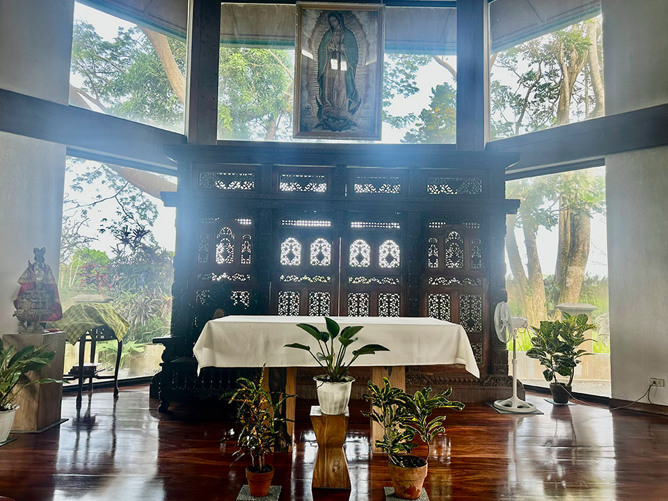 There was a peaceful stillness that opened the heart to a quiet joy. Bougainvillea leaned against the trunks of tall trees, blooming profusely in a shower of pink blossoms. Lush greenery lined a path, punctuating the grass carpet. Seven steps up led to a view of a pond with peace lilies blooming among the red, yellow, and green leaves of Baston de San Jose and San Francisco plants. Behind it were accommodations for those who wanted to spend more than a day in prayer.