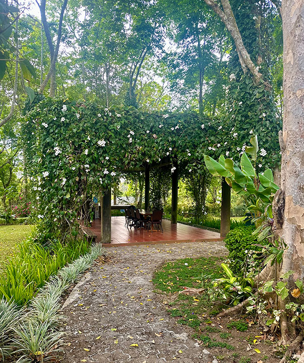 A gazebo on the opposite side was fully covered by vines with little white flowers. Beneath this outdoor pavilion were 10 chairs around a table carved out of a tree, providing a resting place to write, reflect, or maybe have a cup of coffee or tea. If this had been all, it would have been enough to dispel weariness and refresh the spirit, but there was more.