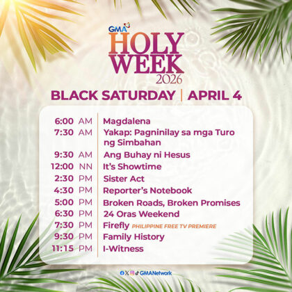 GMA will have special programming from Maundy Thursday to Easter Sunday (April 2 to 5). On Thursday, this will include films like Jesus, My Best Friend’s Wedding, Forrest Gump, and The Ten Commandments. On Friday, child-friendly movies will air as well as family stories such as Siete Palabras, Aguila, and Family of Two. On Saturday, the film Firefly is set to air for the first time on Philippine free TV alongside other reflective and inspirational films. On Sunday, GMA will return to regular programming with programs such as All-Out Sundays and Regal Studio Presents, among others.