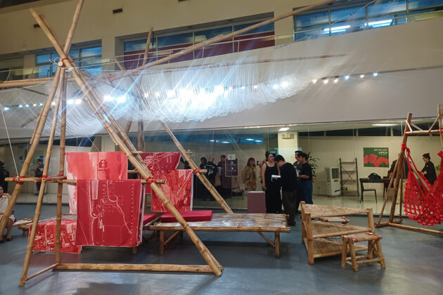The installation at Benilde was one of the most popular on opening night, offering a public space for rest shaped by human and ecological memory. Built in collaboration with fishermen from Talim Island, its canopy draws from the salambao, a traditional lift net once common in Manila Bay and its river networks, and the sakag, a manual push net still commonly used for shrimp fishing.