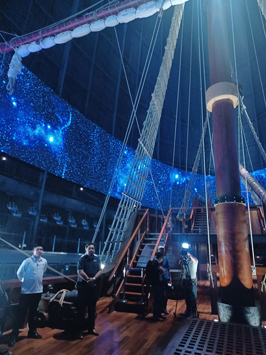 Up on the deck is the most breathtaking part, where visitors can look at the mast and the starboard side and up at a panoramic LED screen displaying a vast seascape or night sky.