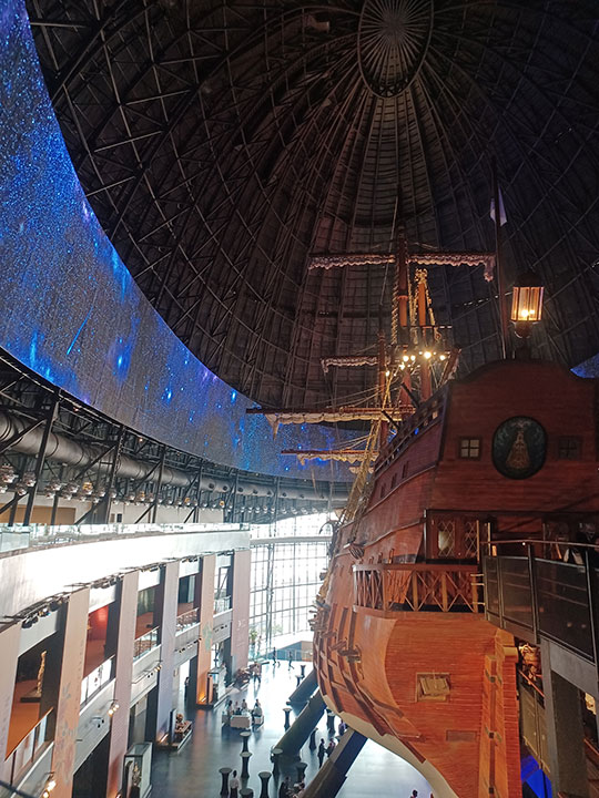 Upon going up the escalator from the welcome hall to the main museum space, the massive structure of the Galeón Espíritu Santo immediately fills your vision. It is 30 meters high and 40 meters long, looking exactly like a seaworthy galleon — except it isn’t.