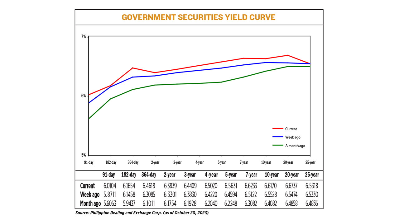 GS yields, which move opposite to prices, went up by an average of 8.25 basis points (bps) week on week, based on PHP Bloomberg Valuation Service Reference Rates as of Oct. 20 published on the Philippine Dealing System’s website.