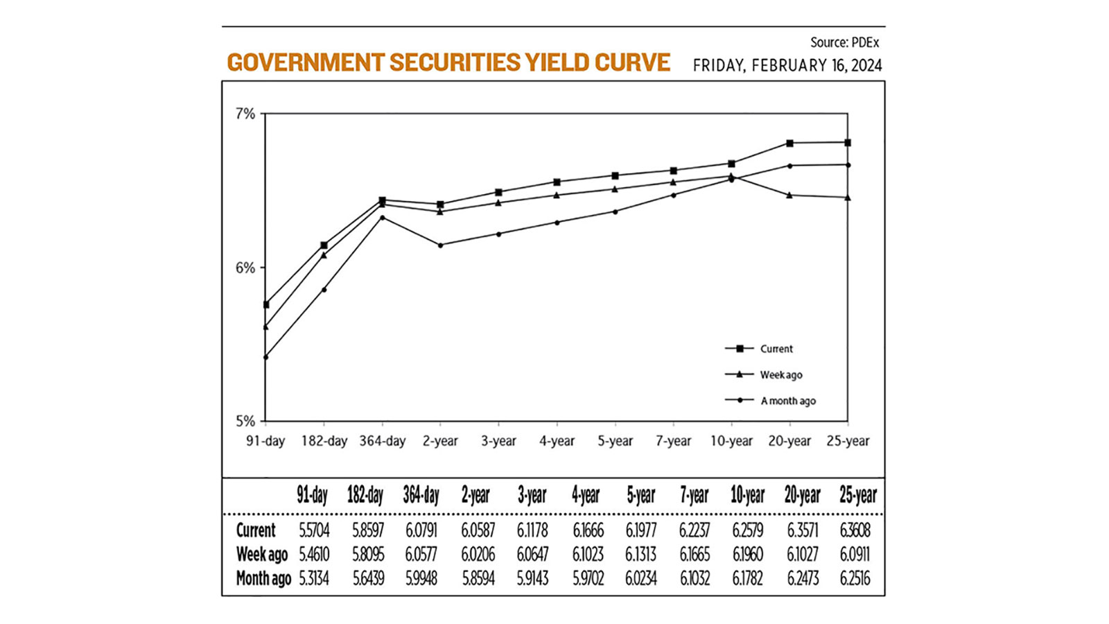 GS yields, which move opposite to prices, went up by an average of 9.51 basis points (bps) week on week at the secondary market, based on the PHP Bloomberg Valuation Service Reference Rates as of Feb. 16 published on the Philippine Dealing System’s website.