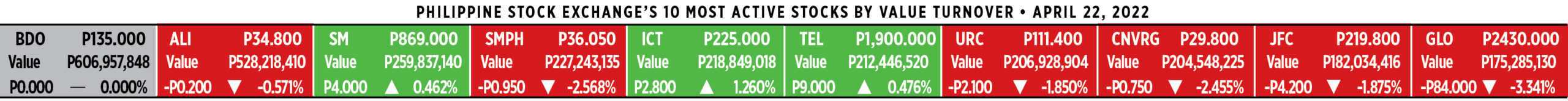 Home Corporate How PSEi member stocks performed — April 22, 2022 Corporate How PSEi member stocks performed — April 22, 2022 April 25, 2022 | 12:00 am Here’s a quick glance at how PSEi stocks fared on Friday, April 22, 2022.