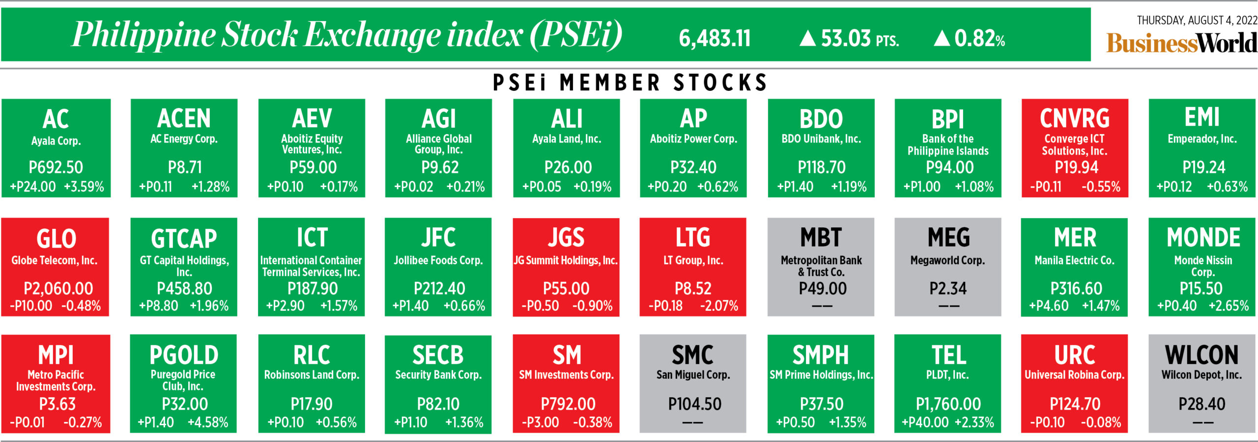 Home Corporate How PSEi member stocks performed — August 4, 2022 Corporate How PSEi member stocks performed — August 4, 2022 August 5, 2022 | 12:00 am Here’s a quick glance at how PSEi stocks fared on Thursday, August 4, 2022.