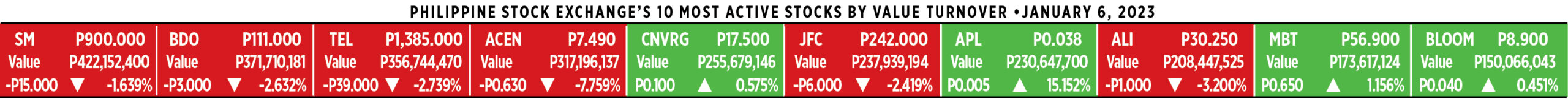 Home Corporate How PSEi member stocks performed — January 6, 2023 Corporate How PSEi member stocks performed — January 6, 2023 January 9, 2023 | 12:23 am Here’s a quick glance at how PSEi stocks fared on Friday, January 6, 2023.