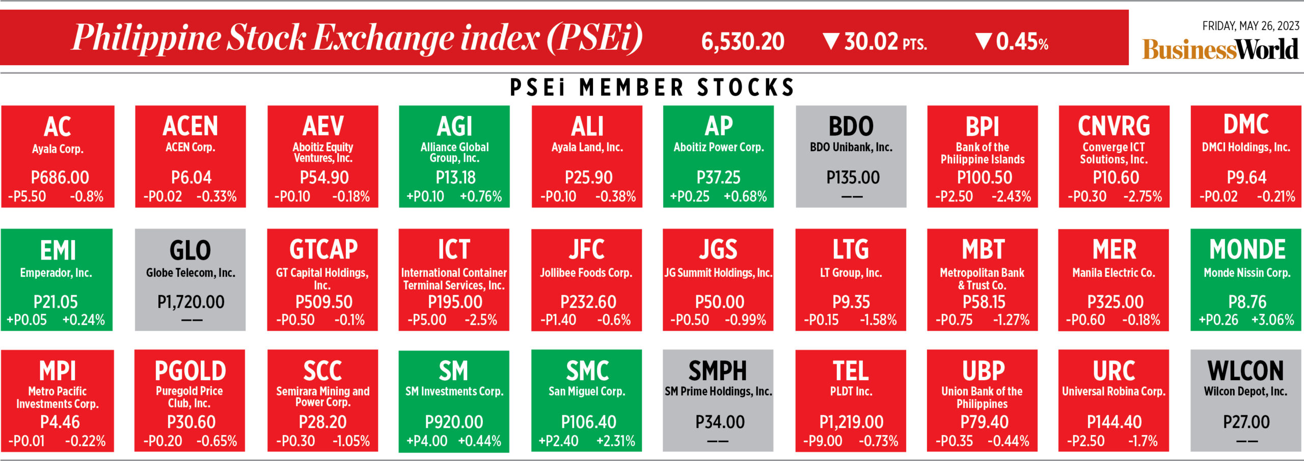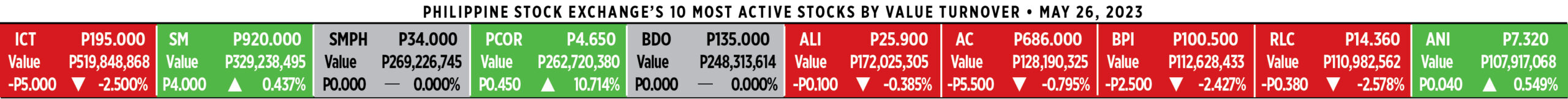 Home Corporate How PSEi member stocks performed — May 26, 2023 Corporate How PSEi member stocks performed — May 26, 2023 May 29, 2023 | 12:00 am Here’s a quick glance at how PSEi stocks fared on Friday, May 26, 2023.