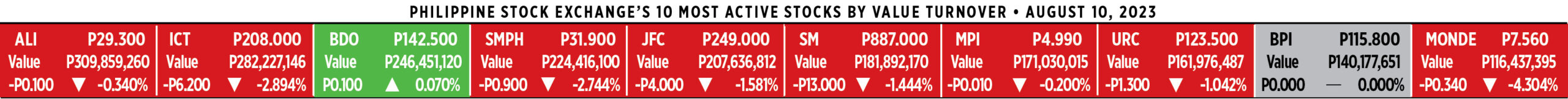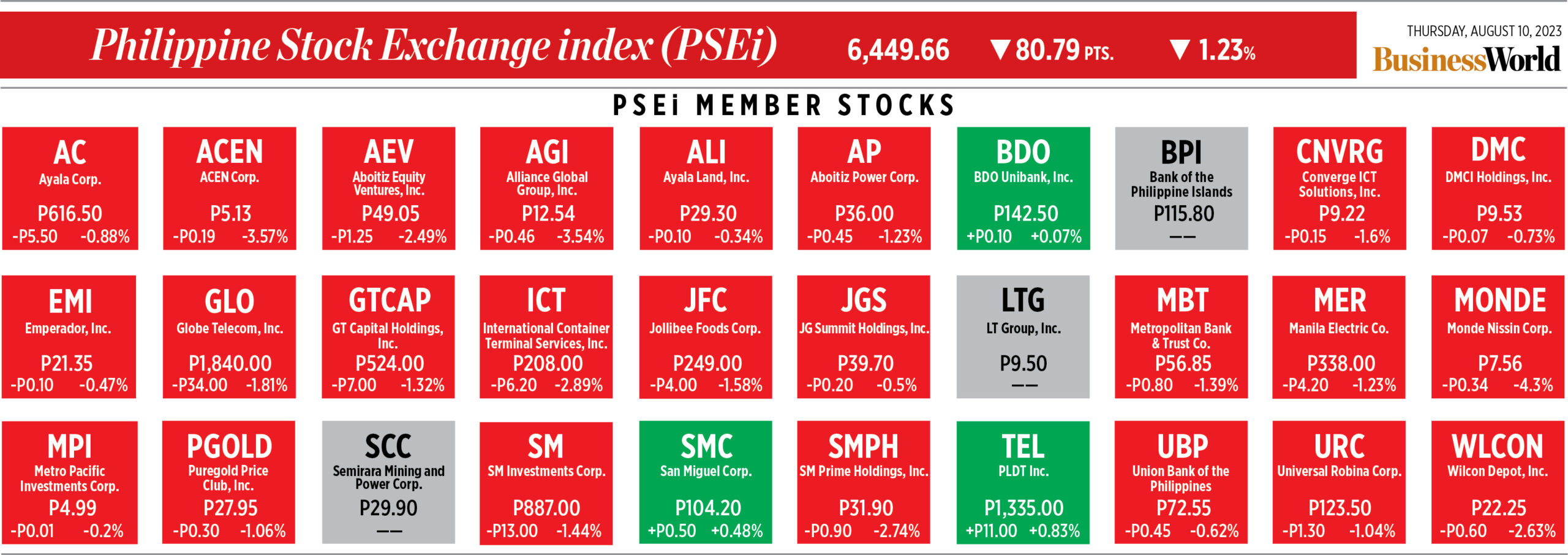 Home Corporate How PSEi member stocks performed — August 10, 2023 Corporate How PSEi member stocks performed — August 10, 2023 August 11, 2023 | 12:00 am Here’s a quick glance at how PSEi stocks fared on Thursday, August 10, 2023.