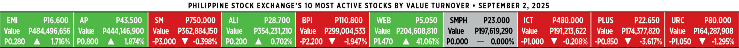 Home Corporate How PSEi member stocks performed — September 2, 2025 Corporate How PSEi member stocks performed — September 2, 2025 September 3, 2025 | 12:00 am Here’s a quick glance at how PSEi stocks fared on Tuesday, September 2, 2025.