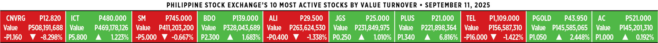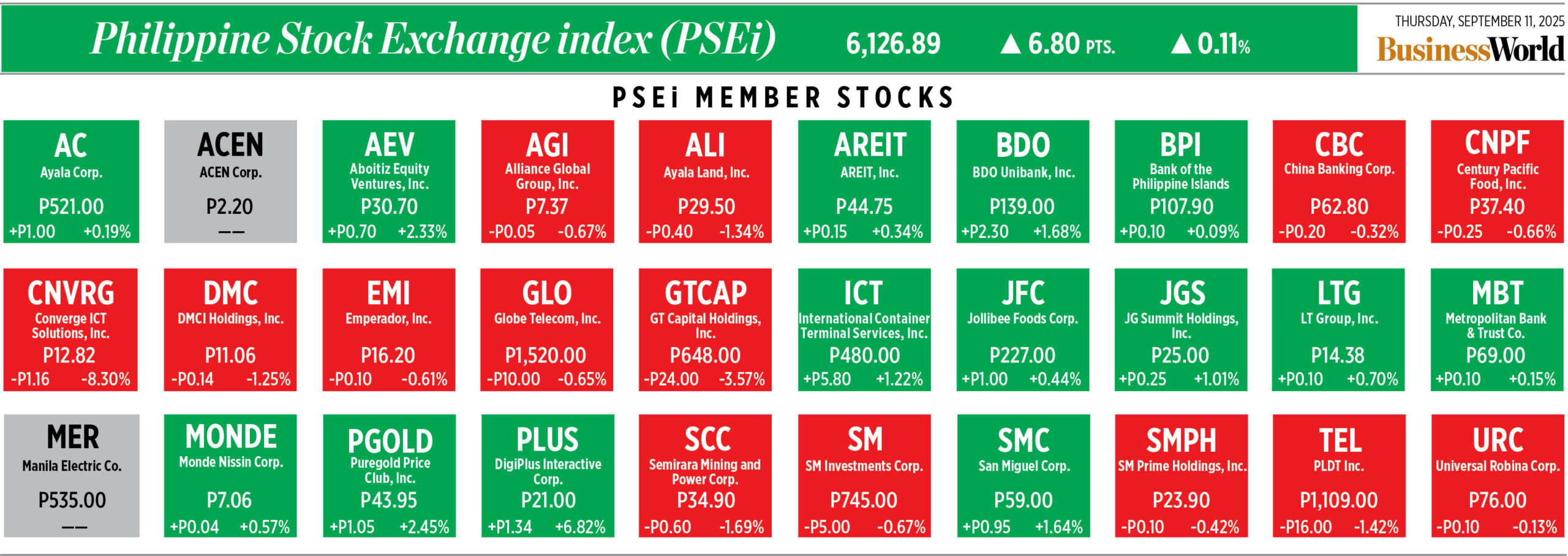 Home Corporate How PSEi member stocks performed — September 11, 2025 Corporate How PSEi member stocks performed — September 11, 2025 September 12, 2025 | 12:00 am Here’s a quick glance at how PSEi stocks fared on Thursday, September 11, 2025.