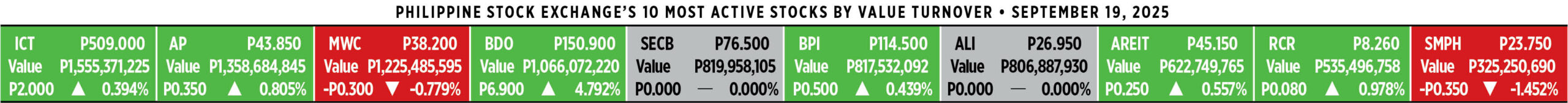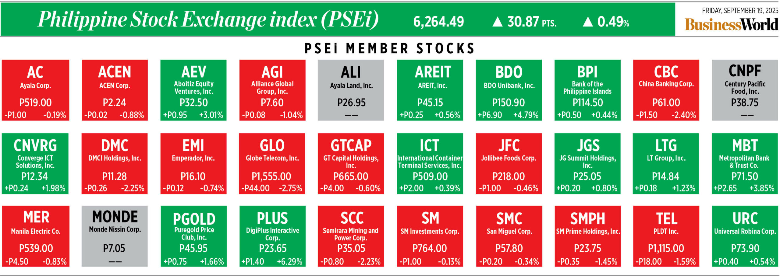 Home Corporate How PSEi member stocks performed — September 19, 2025 Corporate How PSEi member stocks performed — September 19, 2025 September 22, 2025 | 12:00 am Here’s a quick glance at how PSEi stocks fared on Friday, September 19, 2025.
