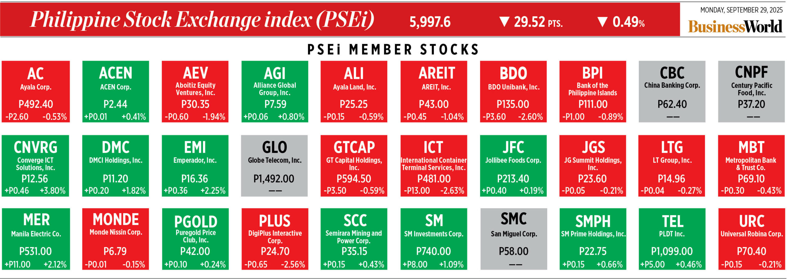 Home Corporate How PSEi member stocks performed — September 29, 2025 Corporate How PSEi member stocks performed — September 29, 2025 September 30, 2025 | 12:00 am Here’s a quick glance at how PSEi stocks fared on Monday, September 29, 2025.