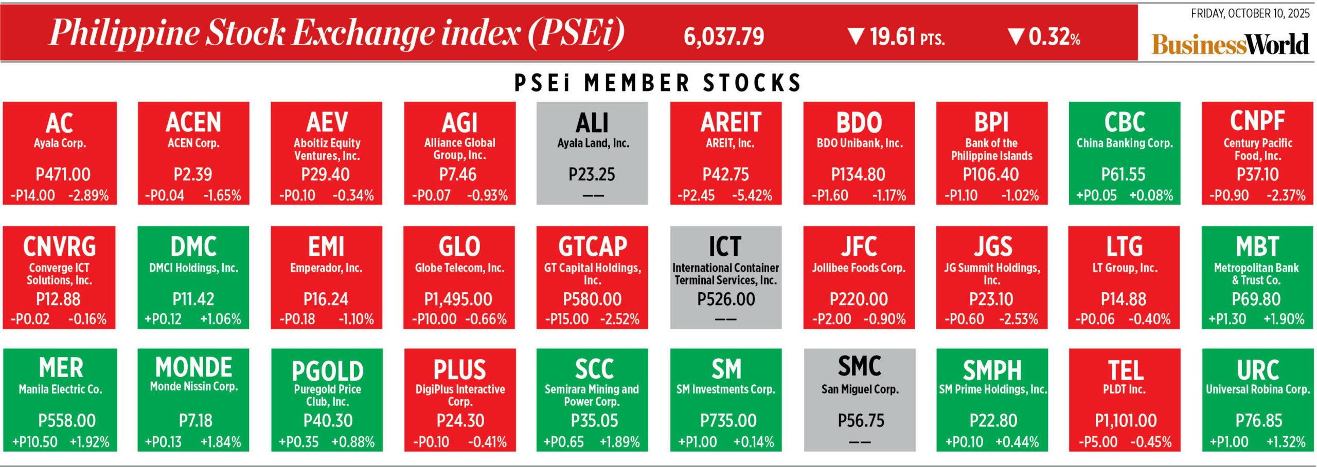 Home Corporate How PSEi member stocks performed — October 10, 2025 Corporate How PSEi member stocks performed — October 10, 2025 October 13, 2025 | 12:00 am Here’s a quick glance at how PSEi stocks fared on Friday, October 10, 2025.