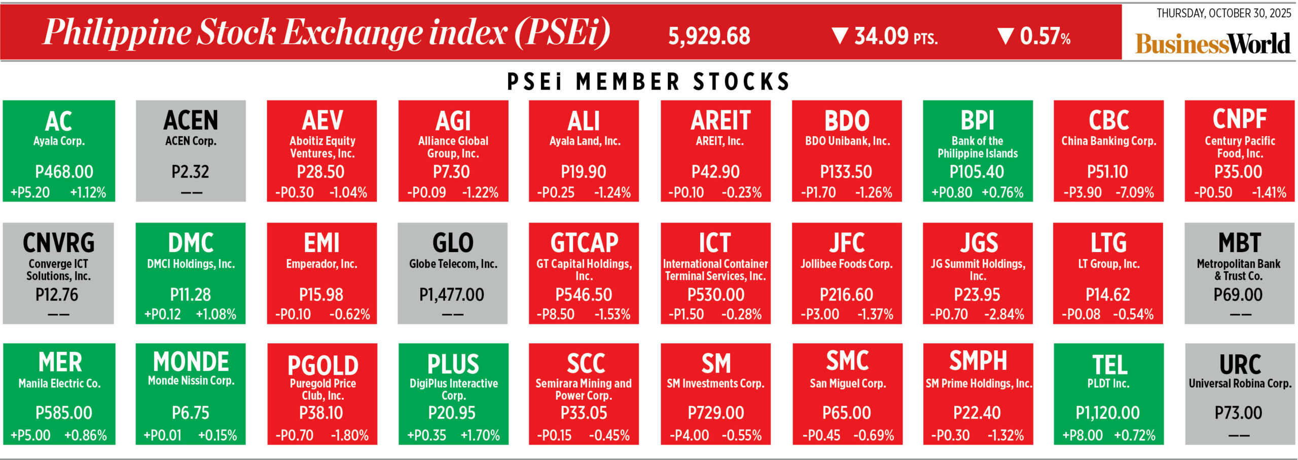 Home Corporate How PSEi member stocks performed — October 30, 2025 Corporate How PSEi member stocks performed — October 30, 2025 October 31, 2025 | 12:00 am Here’s a quick glance at how PSEi stocks fared on Thursday, October 30, 2025.